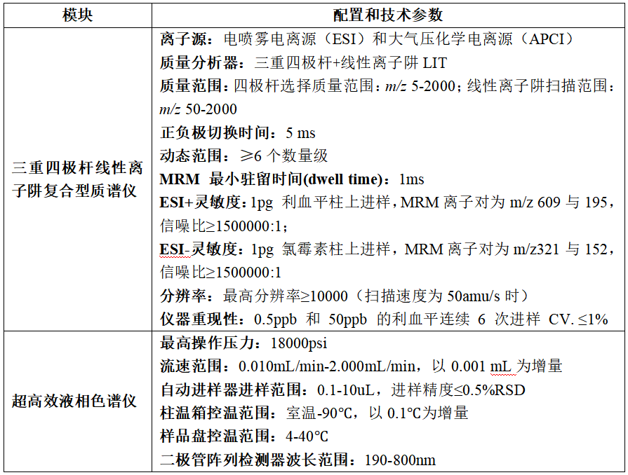 1. 串联质谱功能:具有MS/MS和MS/MS/MS功能。MS/MS 扫描时,一次进样同时获得MRM 定量图谱及MS/MS 全扫描质谱图;MS/MS/MS 扫描时,一次进样同时获得 MRM 定量图谱及各组分子离子二级/三级全扫描质谱图;能用 MRM3 定量以进一步消除复杂体系的相互干扰;