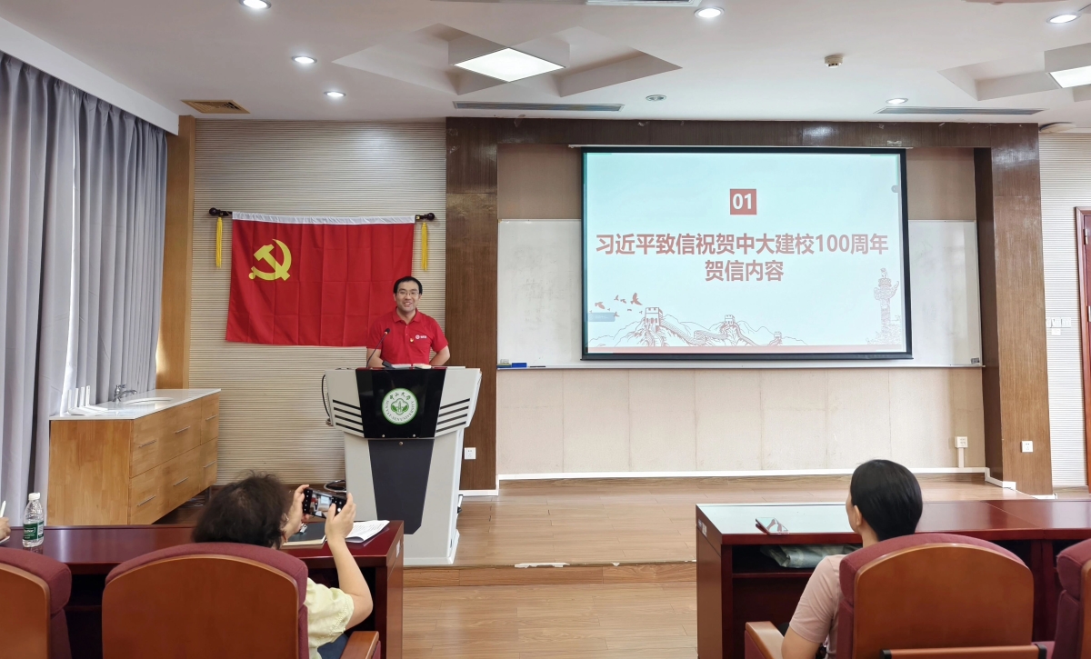 ▲物理学院物理学系教工党支部书记唐健同志领学贺信精神