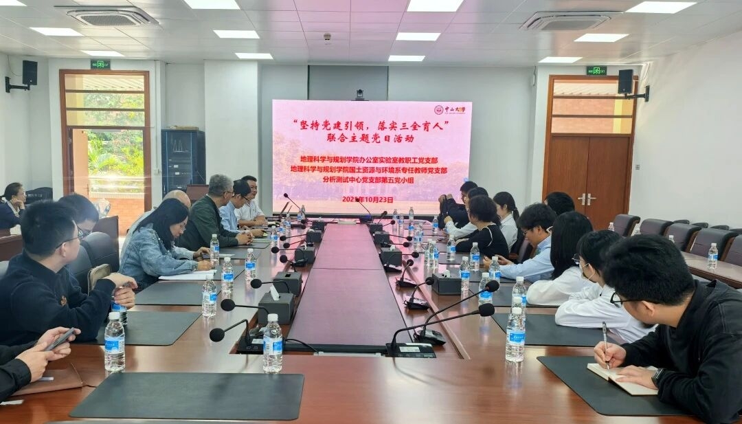 为深入学习贯彻习近平新时代中国特色社会主义思想,紧紧围绕立德树人根本任务,推动“三全育人”工作走深走实,2025年10月23日上午,分析测试中心党支部第五党小组与地理科学与规划学院(以下简称“地理学院”)办公室实验室教职工党支部、国土资源与环境系专任教师党支部在广州校区东校园联合开展“坚持党建引领,落实三全育人”主题党日活动。地理学院党委书记岳辉、办公室实验室教职工党支部书记丁健、国土资源与环境系专任教师党支部书记王大刚、分析测试中心党支部书记黄玲凌等近40名党员参加活动。
