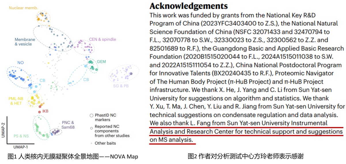 yl1111永利集团生命科学学院松阳洲课题组联合孙逸仙纪念医院基于自主开发的PhastID邻近标记技术,利用分析测试中心高分辨液质联用仪(Orbitrap Fusion Lumos,Thermo),首次系统性捕获了HeLa细胞中18种核内无膜凝聚体的蛋白互作组,绘制出的人类细胞核地图(图1,NOVA Map)揭示了它们在应激条件及疾病相关突变下的动态变化。研究发现,不同凝聚体之间存在广泛的物理接触,并协同完成如端粒酶成熟与组蛋白前体mRNA加工等关键过程。值得一提的是,研究团队还鉴定出一种潜在新的核内凝聚体— BUD13凝聚体(BUD13 NC)。该项工作系统构建了首个人类核内凝聚体地图NOVA Map,为深入理解细胞核内的空间组织及围绕遗传信息流的调控网络提供了全新视角。高分辨率液质联用仪所获得的数据为构建数据库以及展示蛋白质互作组动态提供了关键数据支持,作者在论文中对此表示感谢(图2)。