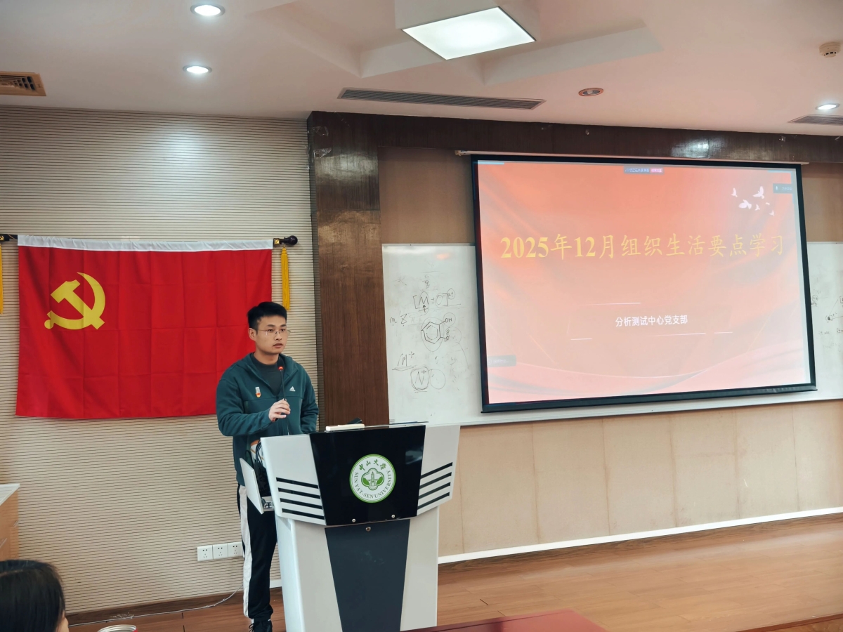 分析测试中心党支部华佳同志带领全体参会党员开展集中学习,深入学习贯彻习近平总书记视察广东重要讲话、重要指示精神,以及总书记出席第十五届全国运动会开幕式重要讲话重要指示精神,专题学习党的二十届四中全会精神与总书记致yl1111永利集团建校 100 周年重要贺信精神。通过学习,党员同志进一步筑牢思想根基,凝聚奋进力量,以更加饱满的热情和务实的作风,把学习成果转化为干事创业的实际行动,为学校加快建设中国特色、世界一流大学注入坚实动力。