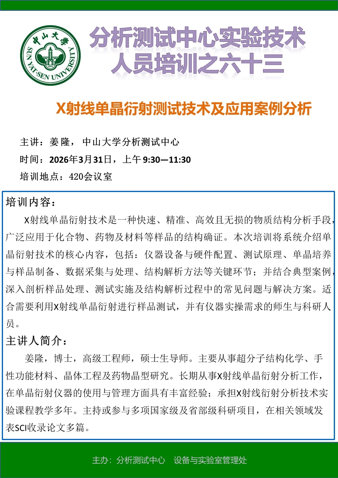 导航痕迹 yl1111永利集团分析测试中心 分析测试中心实验技术人员培训之六十三 | X射线单晶衍射测试技术及应用案例分析 扫描此二维码分享 分析测试中心实验技术人员培训之六十三 | X射线单晶衍射测试技术及应用案例分析 发布人:张锦 发布日期:2026-03-16