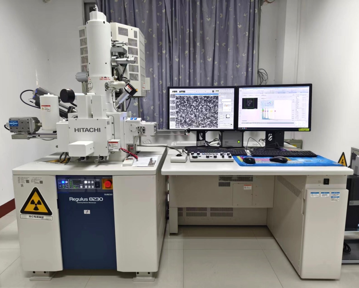 冷场发射高分辨扫描电镜,可对纳米材料/介孔材料等进行形貌观察。配备空间分辨率为10nm的平插能谱和YAG背散射电子探测器,可进行纳米级别材料的能谱分析和背散射电子图像观察。