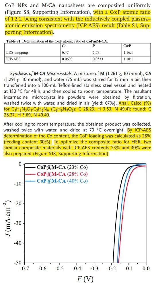 测试中心无机与元素分析平台元素分析仪(elemental analyzer, EA, Elmentar Vario EL)和电感耦合等离子体原子发射光谱仪(inductively coupled plasma atomic emission spectrometry,ICP-AES, PerkinElmer Optima 8300)对文章所用的复合催化剂分别进行M-CA和CoP中各元素组成的定量分析,实现了材料成分确认和催化组分负载量的测定,为后续实验的材料基础提供有效的数据支撑。