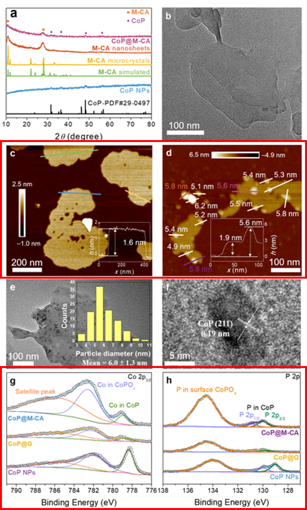 图2 M-CA与CoP@M-CA纳米片的AFM二维成像(c-d);不同材料的高分辨XPS光谱(g-h)