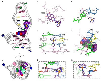 2021年7月,我校化学学院毛宗万教授团队基于四链体-双链杂化体的特定空间结构,设计了一种有机-金属杂化体(L1Pt(dien)),借助相对高的亲和力,该结构可与侧面具有双链loop的核酸四链体MYT1L进行空间选择性匹配。该工作借助核磁共振波谱测试,确定了MYT1L-L1Pt(dien)配合物的溶液结构(图1),阐明了配体与核酸的分子作用机制。该研究成果以“Spatial Matching Selectivity and Solution Structure of Organic-Metal Hybrid to Quadruplex-Duplex Hybrid”为题发表在Angewandte Chemie International Edition上。文章的第一作者是我校博士研究生刘柳宜,通讯作者是我校毛宗万教授和刘文婷副研究员。