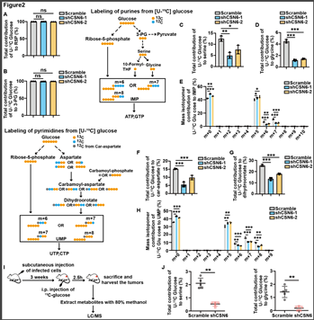 2023年2月,yl1111永利集团附属第六医院方乐堃研究员/李孟鸿教授/兰平教授团队合作,阐明了CSN6可泛素化调控DDX5-PHGDH轴从而影响核苷酸合成,最终诱导结直肠癌的发生发展和耐药,为改善结直肠癌的治疗提供了潜在的治疗靶点。通过碳13标记的葡萄糖结合LC-MS技术,深入分析了敲低CSN6对体内外核苷酸(嘌呤及嘧啶)代谢流的影响,其结果提示沉默CSN6能显著减少丝氨酸和甘氨酸的合成总量,且能明显抑制葡萄糖进入丝氨酸和甘氨酸代谢流,最终导致肌苷一磷酸合成明显减少。同时,敲低CSN6导致氨甲酰天冬氨酸及二氢乳清酸合成明显减少,最终抑制葡萄糖提供碳给尿苷一磷酸合成。测试中心高分辨液质联用仪支撑表征了该工作中基于碳13标记的葡萄糖结合LC-MS技术的代谢流分析。