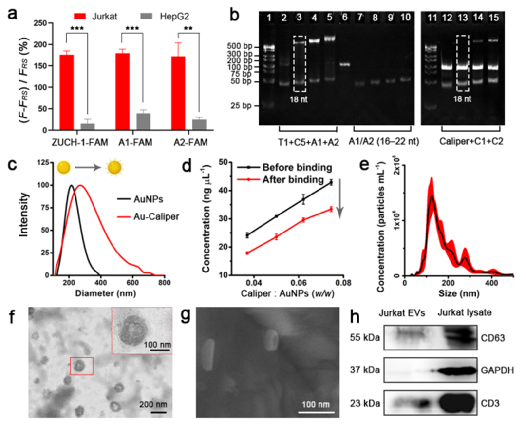 图1. Au-Caliper的组装验证和Jurkat EVs的表征TEM表征Jurkat EVs的形貌(f)