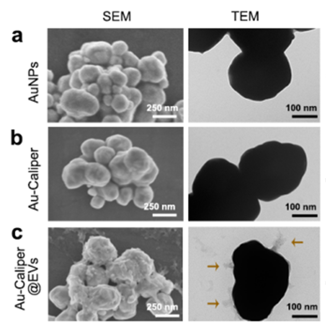 图2. 验证EVs的捕获和释放 (a) AuNPs (b) Au-Caliper (c) Au-Caliper@EVs的SEM、TEM图像