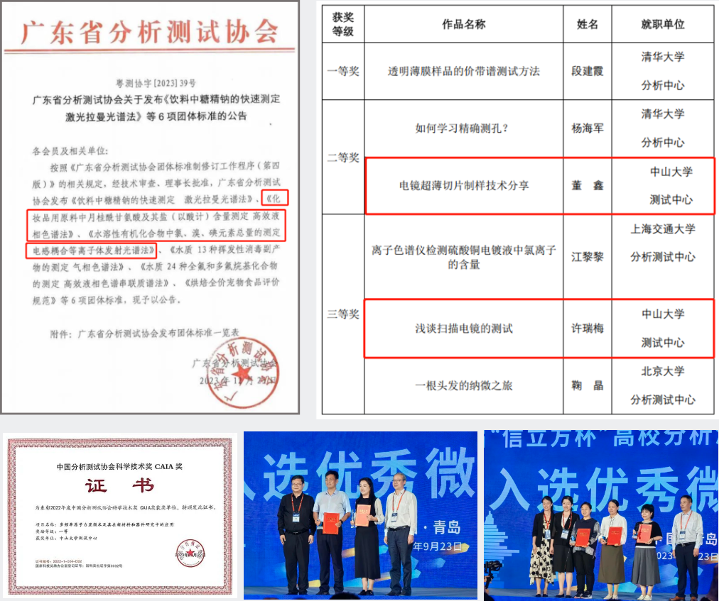 2023年中心技能积累结出累累硕果,作为第一完成单位编制团体标准2项,作为第二完成单位参与编写国家标准1项,作为第二完成单位获得2022年度中国分析测试协会科学技术奖一等奖,在第二届“信立方杯”高校分析测试技术培训微课大赛中荣获二等奖和三等奖。