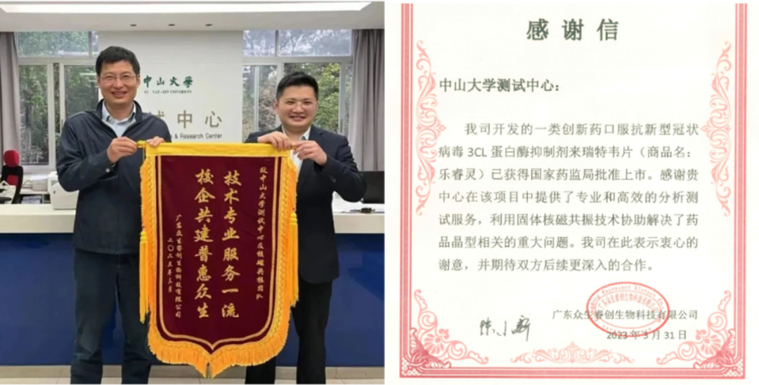 在完成校内测试的前提下,中心积极开展社会服务。2023年完成校外测试样品数15608个(同比增长28.5%),校外接样批数674批,出具CMA报告1676份。2023年3月,中心核磁共振机组利用固体核磁共振技术,协助广东众生睿创生物科技解决了晶型相关的关键问题,支撑我国自主研发新冠药物来瑞特韦片通过药监局评估并顺利上市,自觉履行推进国家科技自立自强的使命担当。