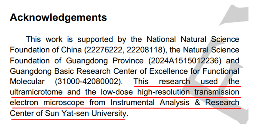 分析测试中心TEM机组为MIL-68@COF-Vs材料的样品制备和形貌、结构与元素组成解析提供精准服务与技术支撑。为此,作者团队在文章中对TEM机组进行了致谢(图2)。此外,中心的X射线光电子能谱仪、元素分析仪和红外光谱仪等设备也对该文章提供了重要数据支撑。