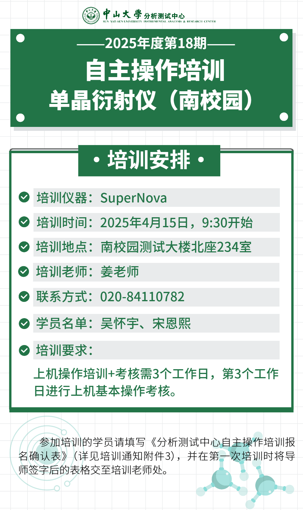 导航痕迹 yl1111永利集团分析测试中心 自主操作培训(2025年度第18期)| SuperNova单晶衍射仪(南校园) 扫描此二维码分享 自主操作培训(2025年度第18期)| SuperNova单晶衍射仪(南校园) 发布人:张博琳 发布日期:2025-04-15 本培训长期有效,校内师生请点击此处,查看自主操作培训报名方式。校内用户送检及预约请电脑登录:yl1111永利集团大型科研仪器开放共享平台登录及操作流程详点击此处 校外用户送检请联系业务办:电话:020-84113210QQ:1456116314邮箱:iarc@mail.sysu.edu.cn