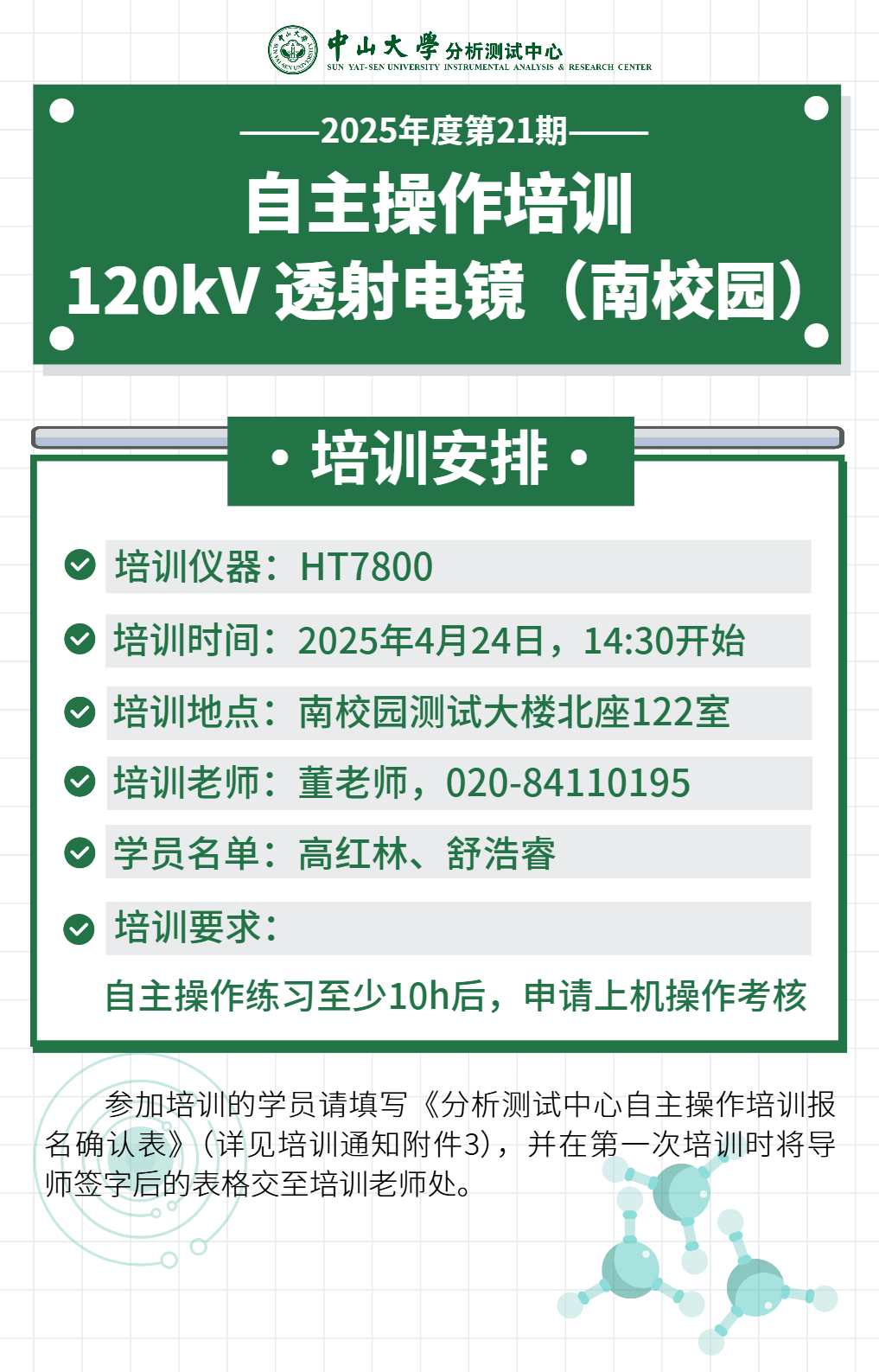 导航痕迹 yl1111永利集团分析测试中心 自主操作培训(2025年度第21期)| 120kV透射电镜(南校园) 扫描此二维码分享 自主操作培训(2025年度第21期)| 120kV透射电镜(南校园) 发布人:张博琳 发布日期:2025-04-23 本培训长期有效,校内师生请点击此处,查看自主操作培训报名方式。校内用户送检及预约请电脑登录:yl1111永利集团大型科研仪器开放共享平台登录及操作流程详点击此处 校外用户送检请联系业务办:电话:020-84113210QQ:1456116314邮箱:iarc@mail.sysu.edu.cn
