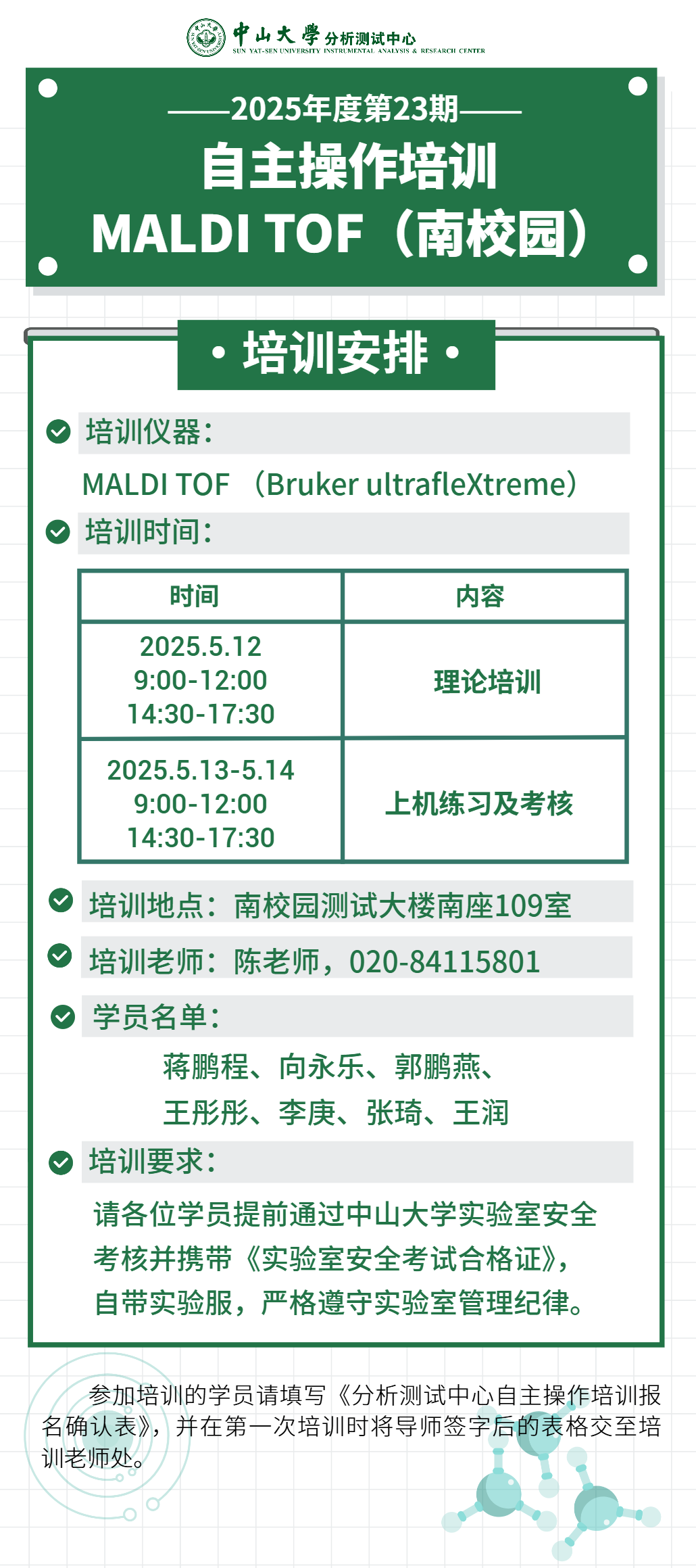 导航痕迹 yl1111永利集团分析测试中心 自主操作培训(2025年度第23期)| 基质辅助激光解吸电离飞行时间质谱(南校园) 扫描此二维码分享 自主操作培训(2025年度第23期)| 基质辅助激光解吸电离飞行时间质谱(南校园) 发布人:张博琳 发布日期:2025-05-09 本培训长期有效,校内师生请点击此处,查看自主操作培训报名方式。校内用户送检及预约请电脑登录:yl1111永利集团大型科研仪器开放共享平台登录及操作流程详点击此处 校外用户送检请联系业务办:电话:020-84113210QQ:1456116314邮箱:iarc@mail.sysu.edu.cn